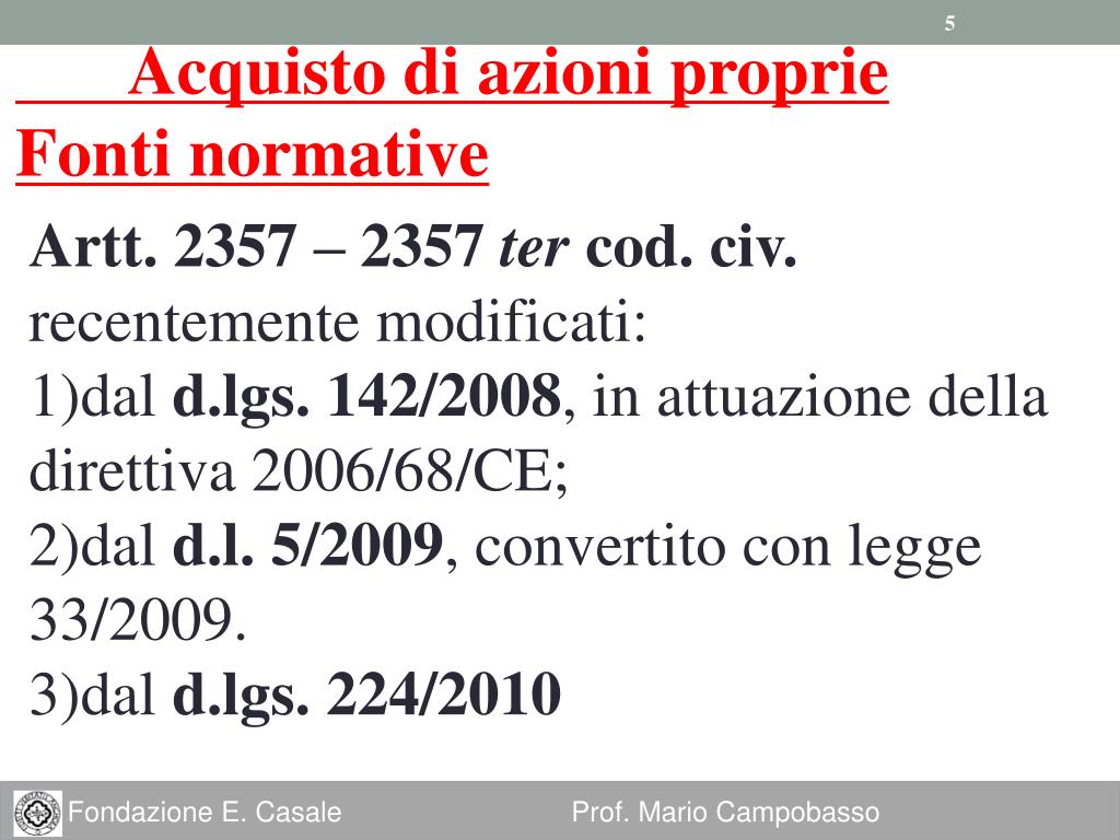 Acquisto di azioni proprie Fonti normative • Artt. 2357 – 2357 ter cod. civ. • recentemente modificati: • dal d.lgs. 142/2008, in attuazione della direttiva 2006/68/CE; • dal d.l. 5/2009, convertito con legge 33/2009. • dal d.lgs. 224/2010