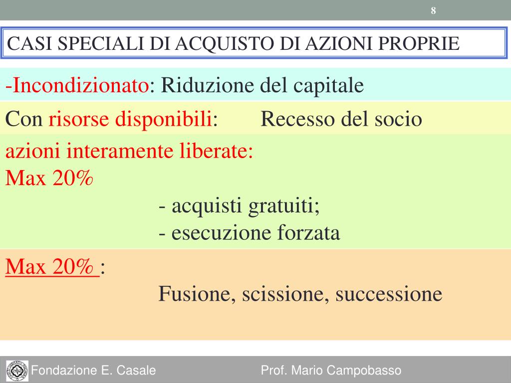 CASI SPECIALI DI ACQUISTO DI AZIONI PROPRIE • Incondizionato: Riduzione del capitale Con risorse disponibili: Recesso del socio • azioni interamente liberate: • Max20% • - acquisti gratuiti; • - esecuzione forzata • Max 20% : • Fusione, scissione, successione