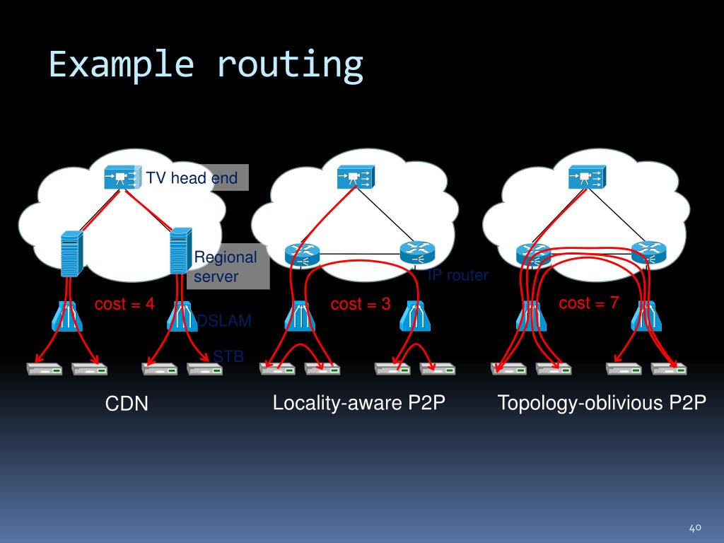 Example routing TV head end Regionalserver IP router cost = 7 cost = 4 cost = 3 DSLAM STB Locality-aware P2P Topology-oblivious P2P CDN