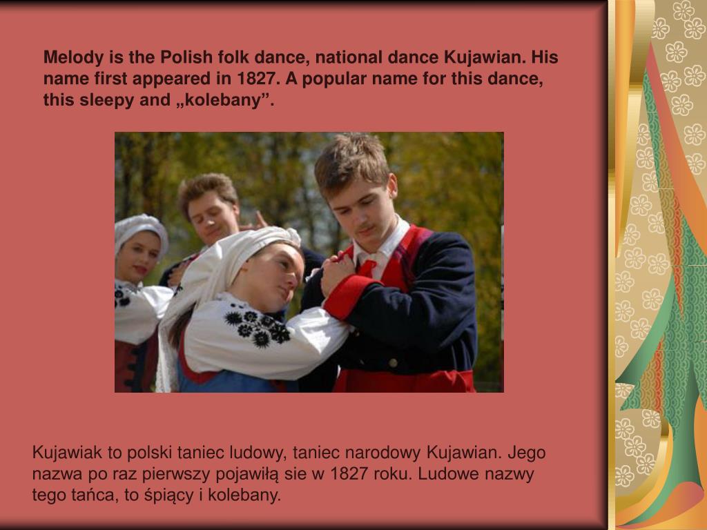 Melody is the Polish folk dance, national dance Kujawian. His name first appeared in 1827. A popular name for this dance, this sleepy and „kolebany”. Kujawiak to polski taniec ludowy, taniec narodowy Kujawian. Jego nazwa po raz pierwszy pojawiłą sie w 1827 roku. Ludowe nazwy tego tańca, to śpiący i kolebany.