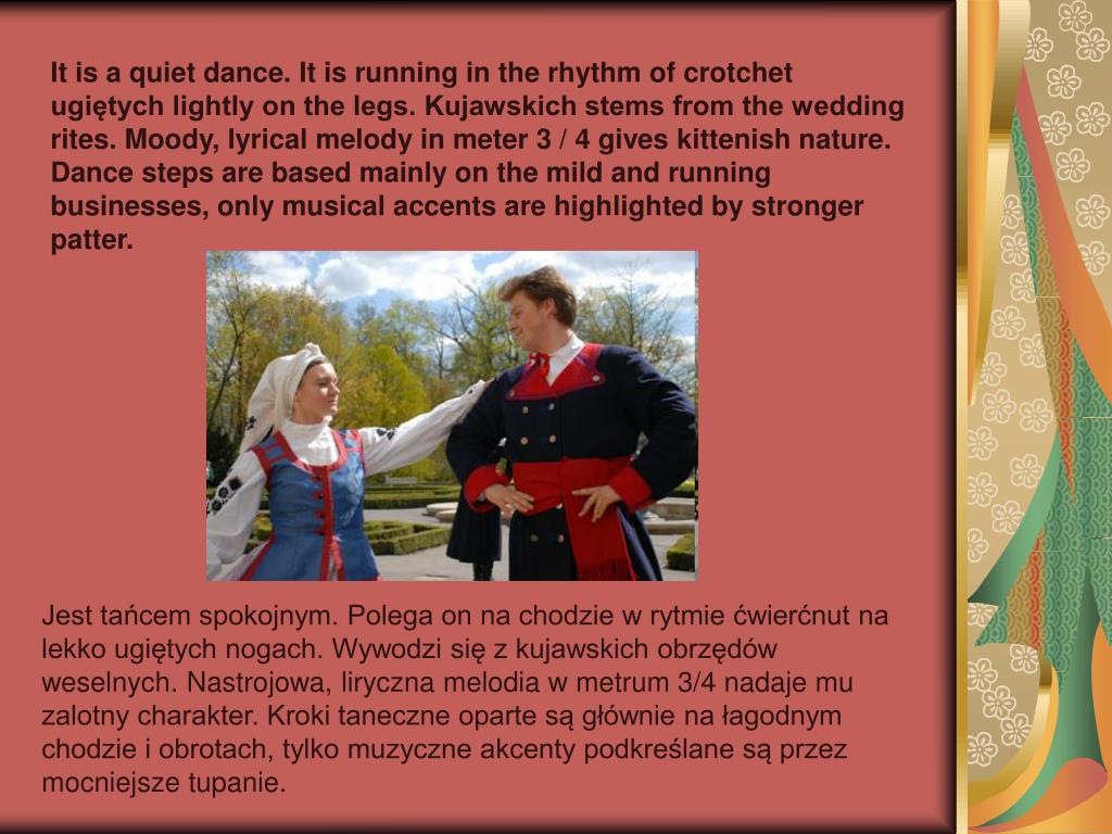 It is a quiet dance. It is running in the rhythm of crotchet ugiętych lightly on the legs. Kujawskich stems from the wedding rites. Moody, lyrical melody in meter 3 / 4 gives kittenish nature. Dance steps are based mainly on the mild and running businesses, only musical accents are highlighted by stronger patter. Jest tańcem spokojnym. Polega on na chodzie w rytmie ćwierćnut na lekko ugiętych nogach. Wywodzi się z kujawskich obrzędów weselnych. Nastrojowa, liryczna melodia w metrum 3/4 nadaje mu zalotny charakter. Kroki taneczne oparte są głównie na łagodnym chodzie i obrotach, tylko muzyczne akcenty podkreślane są przez mocniejsze tupanie.