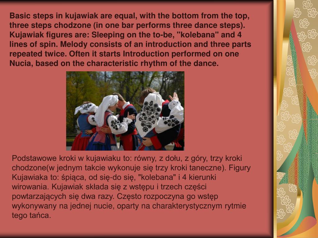 Basic steps in kujawiak are equal, with the bottom from the top, three steps chodzone (in one bar performs three dance steps). Kujawiak figures are: Sleeping on the to-be, "kolebana" and 4 lines of spin. Melody consists of an introduction and three parts repeated twice. Often it starts Introduction performed on one Nucia, based on the characteristic rhythm of the dance. Podstawowe kroki w kujawiaku to: równy, z dołu, z góry, trzy kroki chodzone(w jednym takcie wykonuje się trzy kroki taneczne). Figury Kujawiaka to: śpiąca, od się-do się, "kolebana" i 4 kierunki wirowania. Kujawiak składa się z wstępu i trzech części powtarzających się dwa razy. Często rozpoczyna go wstęp wykonywany na jednej nucie, oparty na charakterystycznym rytmie tego tańca.