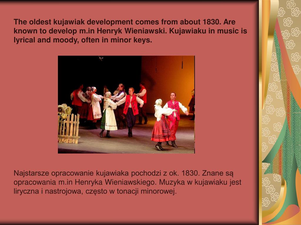 The oldest kujawiak development comes from about 1830. Are known to develop m.in Henryk Wieniawski. Kujawiaku in music is lyrical and moody, often in minor keys. Najstarsze opracowanie kujawiaka pochodzi z ok. 1830. Znane są opracowania m.in Henryka Wieniawskiego. Muzyka w kujawiaku jest liryczna i nastrojowa, często w tonacji minorowej.