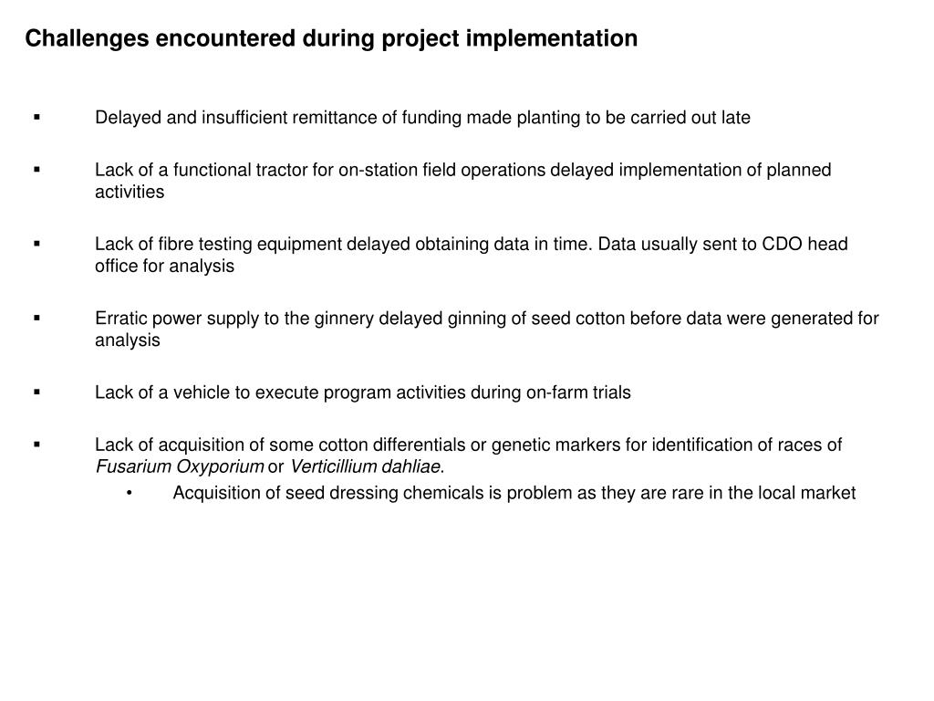 Challenges encountered during project implementation • Delayed and insufficient remittance of funding made planting to be carried out late • Lack of a functional tractor for on-station field operations delayed implementation of planned activities • Lack of fibre testing equipment delayed obtaining data in time. Data usually sent to CDO head office for analysis • Erratic power supply to the ginnery delayed ginning of seed cotton before data were generated for analysis • Lack of a vehicle to execute program activities during on-farm trials • Lack of acquisition of some cotton differentials or genetic markers for identification of races of Fusarium Oxyporium or Verticillium dahliae. • Acquisition of seed dressing chemicals is problem as they are rare in the local market