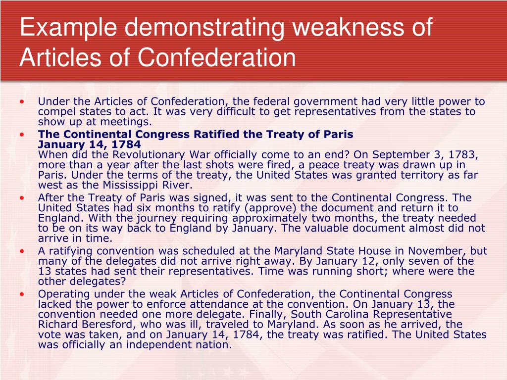 Example demonstrating weakness of Articles of Confederation • Under the Articles of Confederation, the federal government had very little power to compel states to act. It was very difficult to get representatives from the states to show up at meetings. • The Continental Congress Ratified the Treaty of Paris January 14, 1784 When did the Revolutionary War officially come to an end? On September 3, 1783, more than a year after the last shots were fired, a peace treaty was drawn up in Paris. Under the terms of the treaty, the United States was granted territory as far west as the Mississippi River. • After the Treaty of Paris was signed, it was sent to the Continental Congress. The United States had six months to ratify (approve) the document and return it to England. With the journey requiring approximately two months, the treaty needed to be on its way back to England by January. The valuable document almost did not arrive in time. • A ratifying convention was scheduled at the Maryland State House in November, but many of the delegates did not arrive right away. By January 12, only seven of the 13 states had sent their representatives. Time was running short; where were the other delegates? • Operating under the weak Articles of Confederation, the Continental Congress lacked the power to enforce attendance at the convention. On January 13, the convention needed one more delegate. Finally, South Carolina Representative Richard Beresford, who was ill, traveled to Maryland. As soon as he arrived, the vote was taken, and on January 14, 1784, the treaty was ratified. The United States was officially an independent nation.