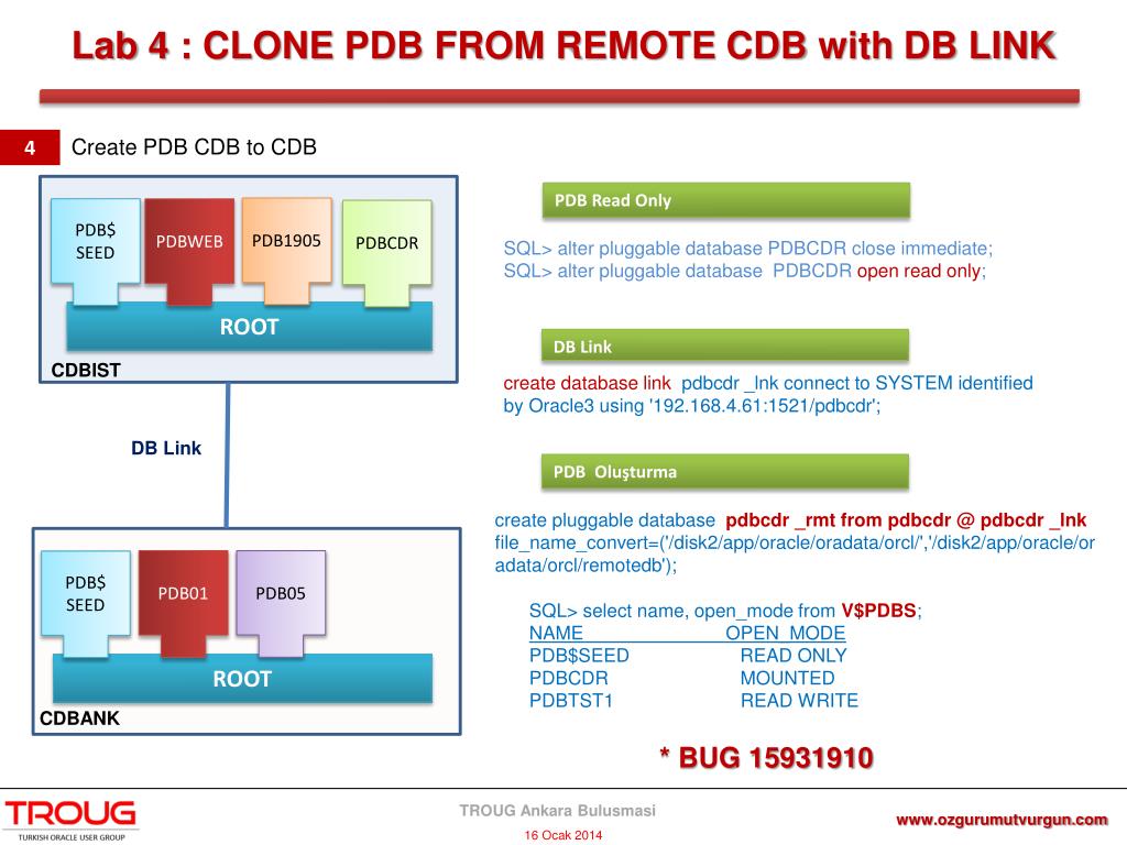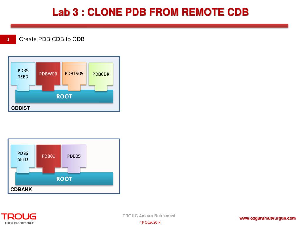 SQL> select pdb_name, status from CDB_PDBS; PDB_NAME STATUS PDB$SEED NORMAL PDBTST1 NORMAL TST06 UNPLUG SQL> select name, open_mode from V$PDBS; NAME OPEN_MODE PDB$SEED READ ONLY TST06 MOUNTED PDBTST1 READ WRITE Lab 4 : CLONE PDB FROM REMOTE CDB with DB LINK Create PDB CDB to CDB 4 PDB Read Only PDB1905 PDB$ SEED PDBWEB PDBCDR SQL> alterpluggabledatabase PDBCDR closeimmediate; SQL> alterpluggabledatabase PDBCDR openreadonly; ROOT DB Link CDBIST scp -r * oracle@192.168.4.61:/disk2/setup_files/datafiles SQL> select pdb_name, status from CDB_PDBS; PDB_NAME STATUS PDB$SEED NORMAL PDBTST1 NORMAL create pluggable database TST06 using '/disk2/setup_files/ pdborcl.xml' source_file_name_convert (‘……, ……') nocopy tempfile reuse; create database link pdbcdr _lnk connect to SYSTEM identified by Oracle3 using '192.168.4.61:1521/pdbcdr'; DB Link PDB Oluşturma create pluggable database pdbcdr _rmt from pdbcdr @ pdbcdr _lnkfile_name_convert=('/disk2/app/oracle/oradata/orcl/','/disk2/app/oracle/oradata/orcl/remotedb'); PDB01 PDB05 PDB$ SEED SQL> select name, open_mode from V$PDBS; NAME OPEN_MODE PDB$SEED READ ONLY PDBCDR MOUNTED PDBTST1 READ WRITE ROOT CDBANK * BUG 15931910 www.ozgurumutvurgun.com TROUG Ankara Bulusmasi