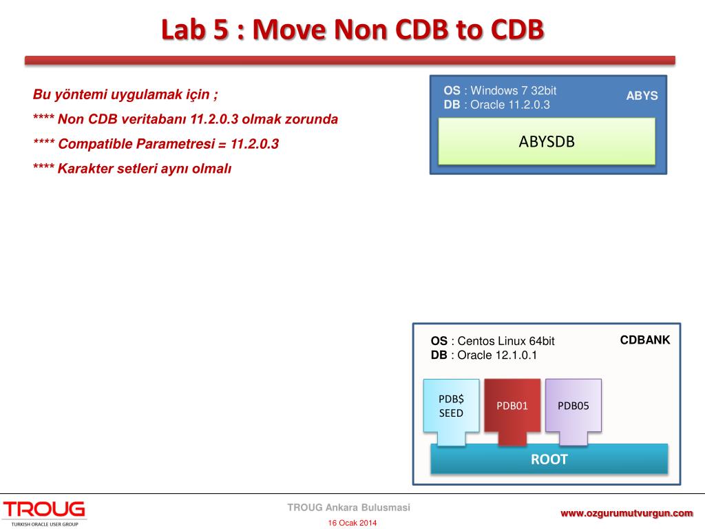 Lab 5 : MoveNon CDB to CDB OS : Windows 7 32bit DB : Oracle 11.2.0.3 ABYS 4. Dosyaların Transferi CDRDB FTP ile kopyalama *** $scp –r exp_files oracle@test2:/disk2/backup ABYSDB 5. Pluggable DB Oluşturma DMP Dosyası ABYS CREATE PLUGGABLE DATABASE abys ADMIN USER adminIDENTIFIED BY abys ROLES = (connect,resource); Alterpluggabledatabase ABYS openreadwrite ; 6. Restore Datafiles CDBANK OS : Centos Linux 64bit DB : Oracle 12.1.0.1 run { CONVERT DATAFILE '/disk2/exp/ABYS.dbf' DB_FILE_NAME_CONVERT="/disk2/exp/import/ABYS.dbf", "/disk2/app/oracle/oradata/orcl/abys_a/ABYS.dbf" FORMAT='/disk2/app/oracle/oradata/orcl/abys_a/ABYS.dbf';…………………….. PDB01 PDB05 PDB$ SEED ROOT www.ozgurumutvurgun.com TROUG Ankara Bulusmasi