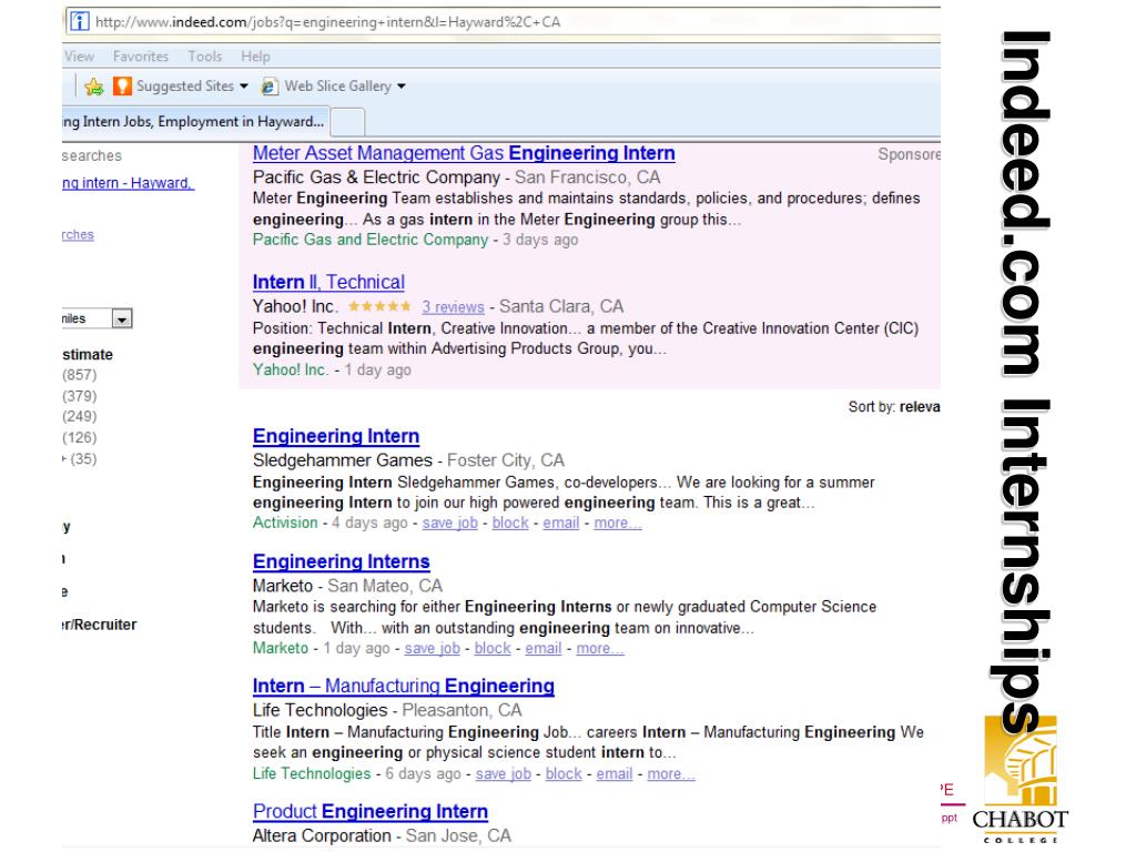 Recent Chabot Engineering Internships • Thein Win → Kiewit Pacific • Ishmael Ayesh → Kiewit Pacific • Nic Vickers → OptiSolar • Melissa Quemada → UCSB INSET • Alvin Lee → UCSB INSET • Bruce Mayer (Cabrillo College) → Lawrence Berkeley National Laboratory (LBNL) • Well, Maybe Not So RECENT