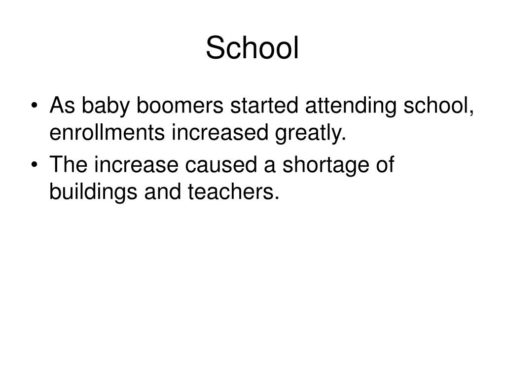 School • As baby boomers started attending school, enrollments increased greatly. • The increase caused a shortage of buildings and teachers.