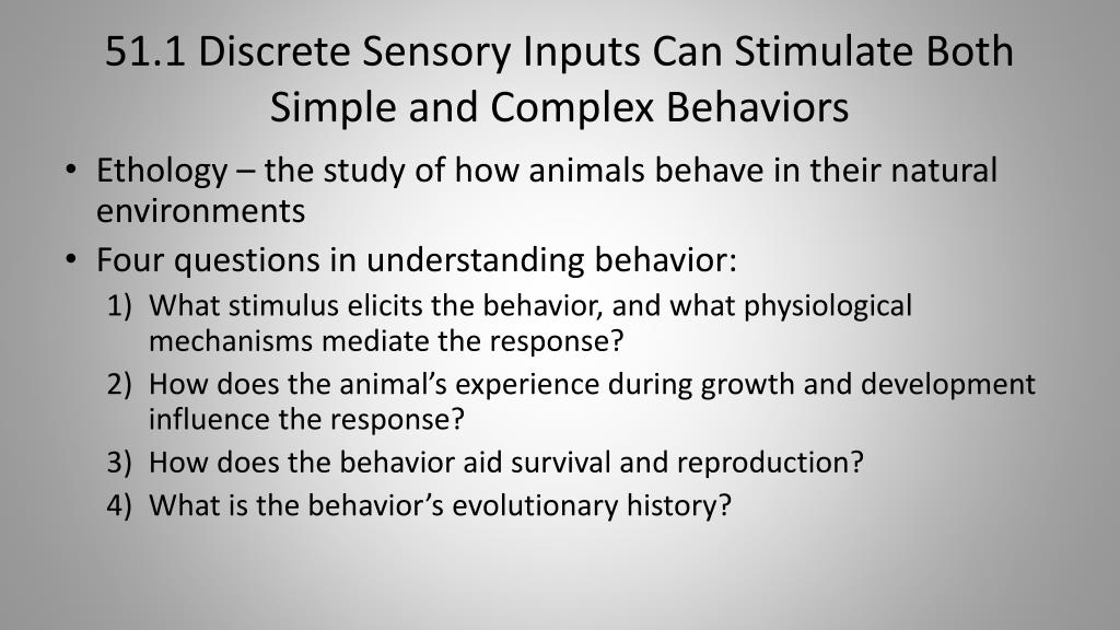 Chapter 51: Animal Behavior. Featuring Star Teachers: Ryan O’Kane Torpey White a nd Zakk Drumm. 51.1 Discrete Sensory Inputs Can Stimulate Both Simple and Complex Behaviors. Ethology – the study of how animals behave in their natural environments Four questions in understanding behavior: