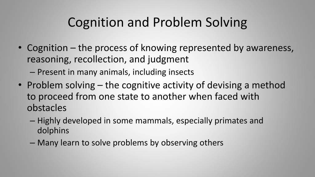 Cognition and Problem Solving • Cognition – the process of knowing represented by awareness, reasoning, recollection, and judgment • Present in many animals, including insects • Problem solving – the cognitive activity of devising a method to proceed from one state to another when faced with obstacles • Highly developed in some mammals, especially primates and dolphins • Many learn to solve problems by observing others