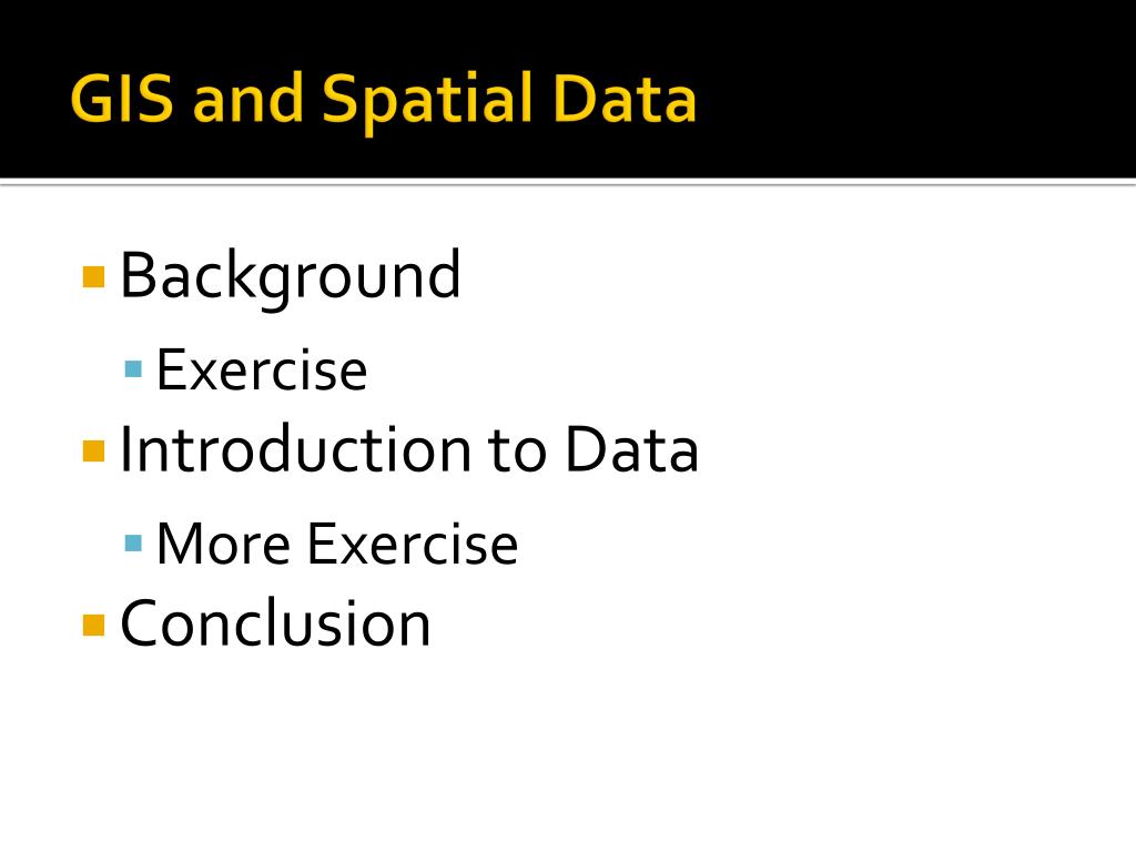 GIS and Spatial Data • Background • Exercise • Introduction to Data • More Exercise • Conclusion