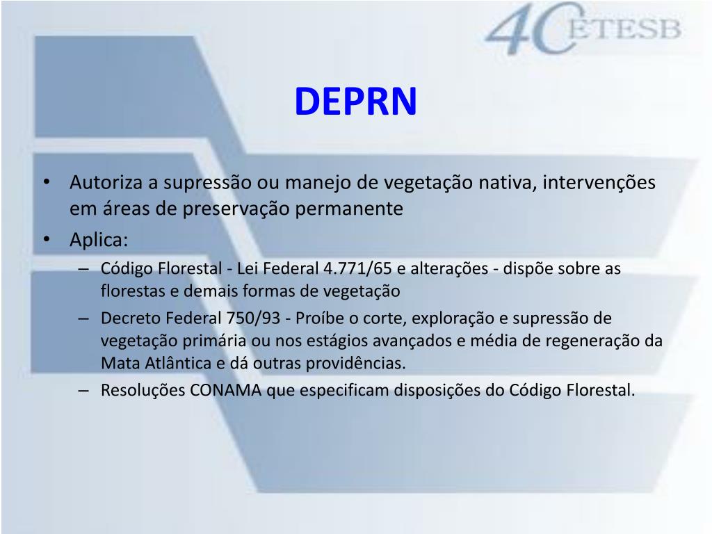 DEPRN • Autoriza a supressão ou manejo de vegetação nativa, intervenções em áreas de preservação permanente • Aplica: • Código Florestal - Lei Federal 4.771/65 e alterações - dispõe sobre as florestas e demais formas de vegetação • Decreto Federal 750/93 - Proíbe o corte, exploração e supressão de vegetação primária ou nos estágios avançados e média de regeneração da Mata Atlântica e dá outras providências. • Resoluções CONAMA que especificam disposições do Código Florestal.