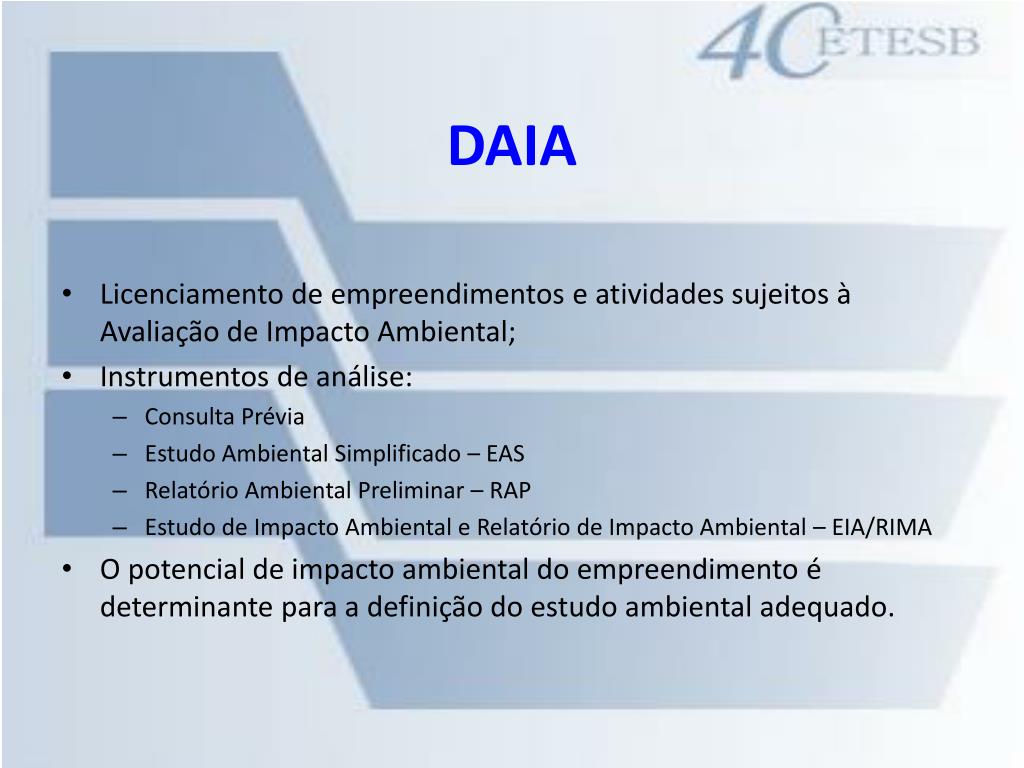 DAIA • Licenciamento de empreendimentos e atividades sujeitos à Avaliação de Impacto Ambiental; • Instrumentos de análise: • Consulta Prévia • Estudo Ambiental Simplificado – EAS • Relatório Ambiental Preliminar – RAP • Estudo de Impacto Ambiental e Relatório de Impacto Ambiental – EIA/RIMA • O potencial de impacto ambiental do empreendimento é determinante para a definição do estudo ambiental adequado.