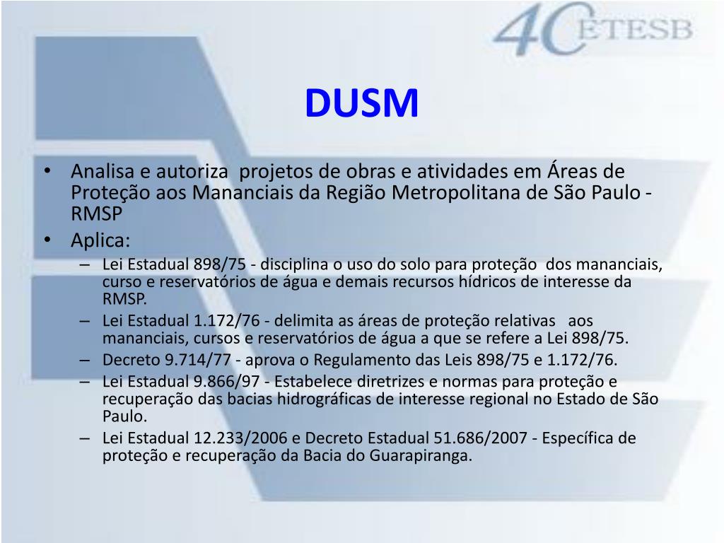 DUSM • Analisa e autoriza projetos de obras e atividades em Áreas de Proteção aos Mananciais da Região Metropolitana de São Paulo - RMSP • Aplica: • Lei Estadual 898/75 - disciplina o uso do solo para proteção dos mananciais, curso e reservatórios de água e demais recursos hídricos de interesse da RMSP. • Lei Estadual 1.172/76 - delimita as áreas de proteção relativas aos mananciais, cursos e reservatórios de água a que se refere a Lei 898/75. • Decreto 9.714/77 - aprova o Regulamento das Leis 898/75 e 1.172/76. • Lei Estadual 9.866/97 - Estabelece diretrizes e normas para proteção e recuperação das bacias hidrográficas de interesse regional no Estado de São Paulo. • Lei Estadual 12.233/2006 e Decreto Estadual 51.686/2007 - Específica de proteção e recuperação da Bacia do Guarapiranga.