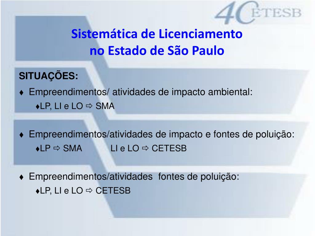 Sistemática de Licenciamento no Estado de São Paulo SITUAÇÕES: • Empreendimentos/ atividades de impacto ambiental: • LP, LI e LO SMA • Empreendimentos/atividades de impacto e fontes de poluição: • LP SMA LI e LO CETESB • Empreendimentos/atividades fontes de poluição: • LP, LI e LO CETESB