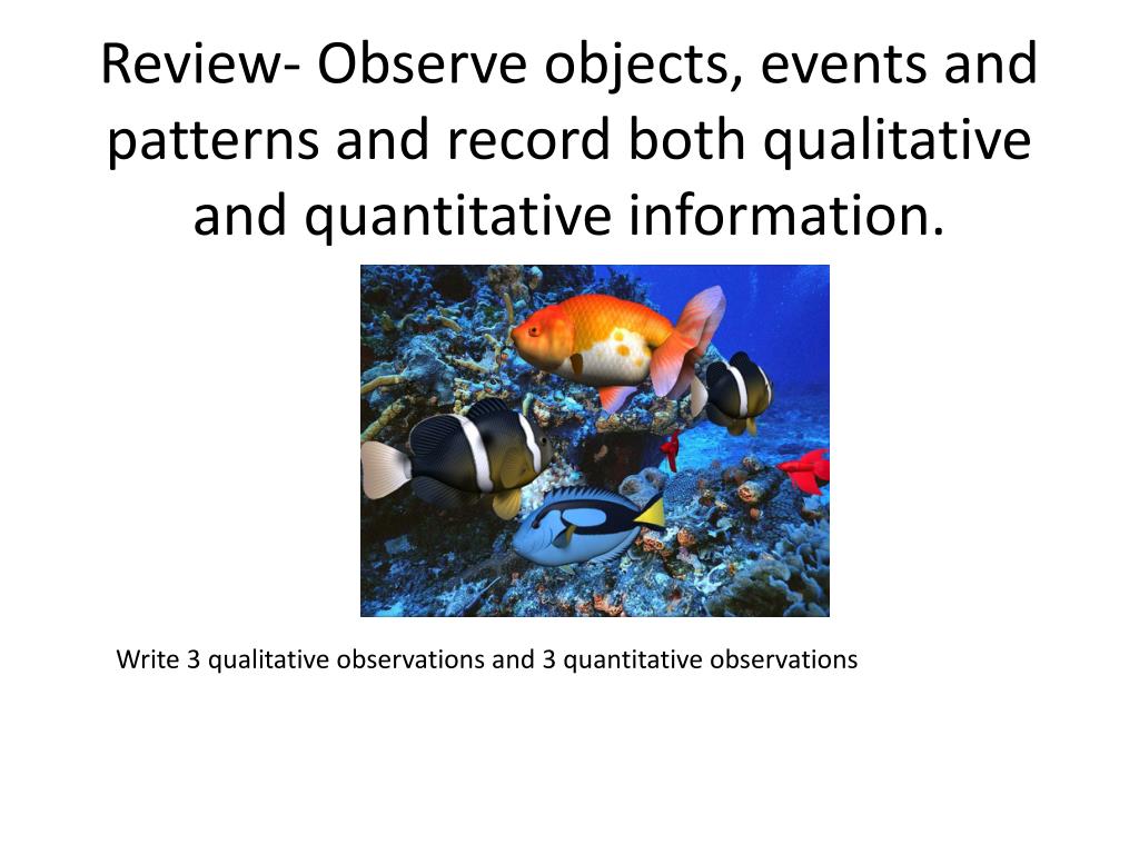 Review- Observe objects, events and patterns and record both qualitative and quantitative information. Write 3 qualitative observations and 3 quantitative observations