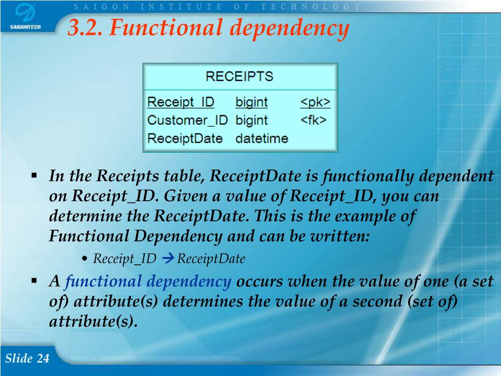 3.3. What is determinant? • The attribute on the left side of the functional dependency is called the determinant • Example: • Receipt_ID  ReceiptDate