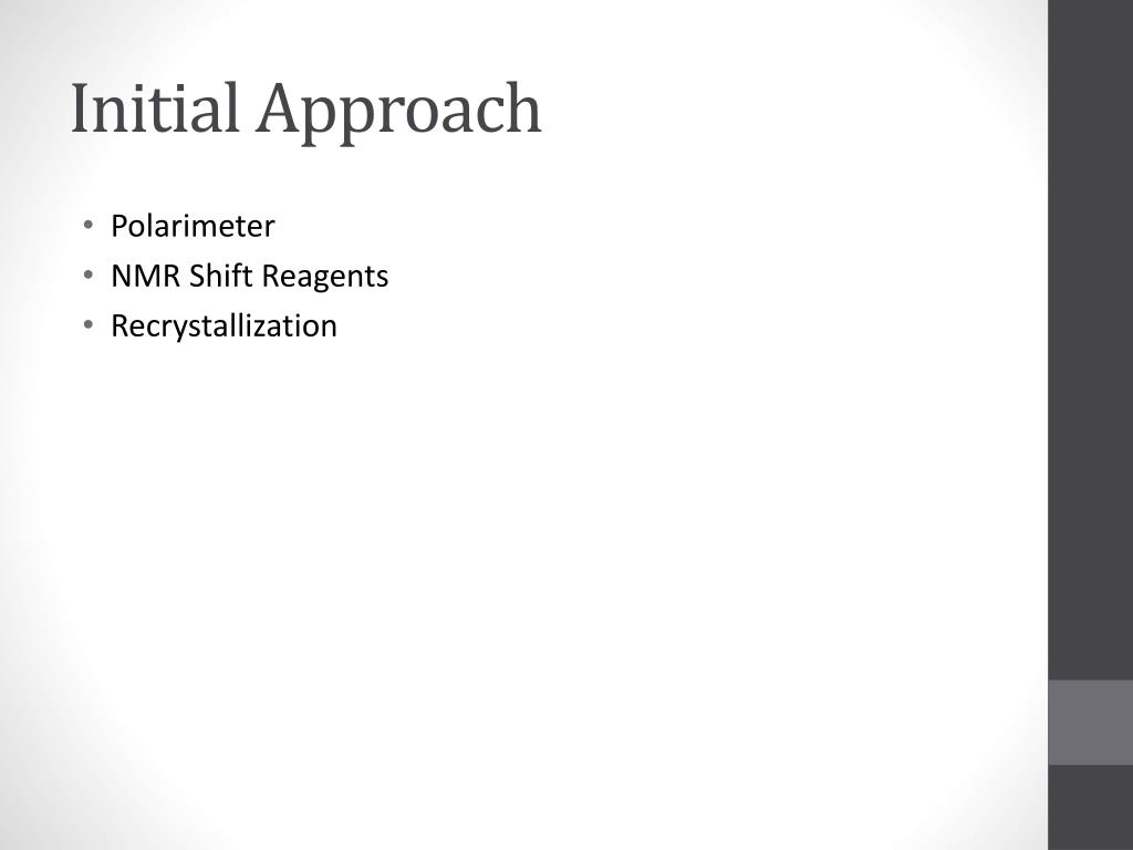 Initial Approach • Polarimeter • NMR Shift Reagents • Recrystallization
