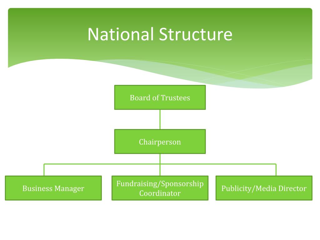 National Structure Board of Trustees Chairperson Business Manager Fundraising/Sponsorship Coordinator Publicity/Media Director