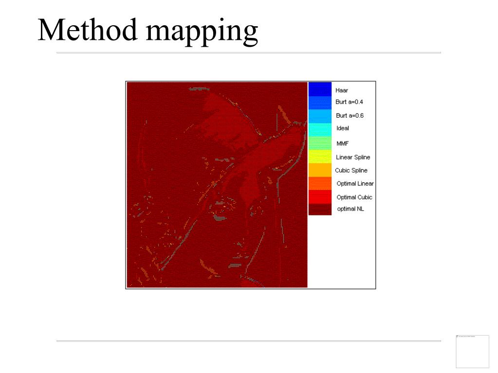 Numerical results Entropies : • Lena : 7.44 • Burt(0.6) : 5.69 • Spline(3) : 5.61 • Cubic interpolation : 5.43 • Approx. opt. NL : 5.39 • MMF : 5.35 • DPCM : 5.03