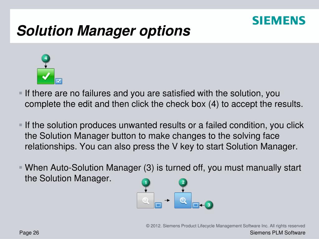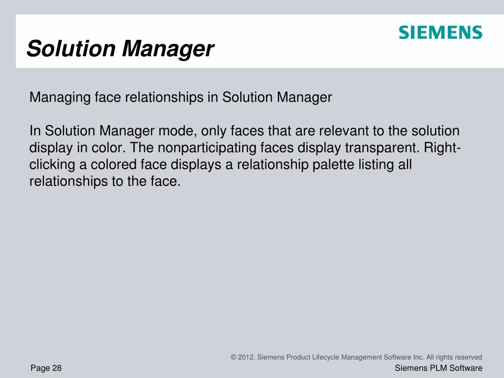 Solution Manager overview • It is possible that a synchronous edit could fail due to an over constrained condition. It is also possible for a synchronous edit be successful but produce unexpected or unwanted results. • Solution Manager provides detail and actions regarding the faces participating in the solution of a synchronous edit. Solution Manager is a tool that graphically interacts with the model to provide control of all relationships relevant to the current solve. • Solution Manager is an optional step during synchronous move or edit operations.