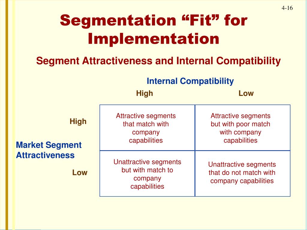 Segmentation “Fit” for Implementation Unattractive segments but with match to company capabilities Unattractive segments that do not match with company capabilities Segment Attractiveness and Internal Compatibility Internal Compatibility High Low Attractive segments that match with company capabilities Attractive segments but with poor match with company capabilities High Market Segment Attractiveness Low