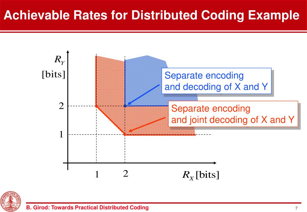 Separate encodingand decoding of X and Y Separate encodingand joint decoding of X and Y Achievable Rates for Distributed Coding Example