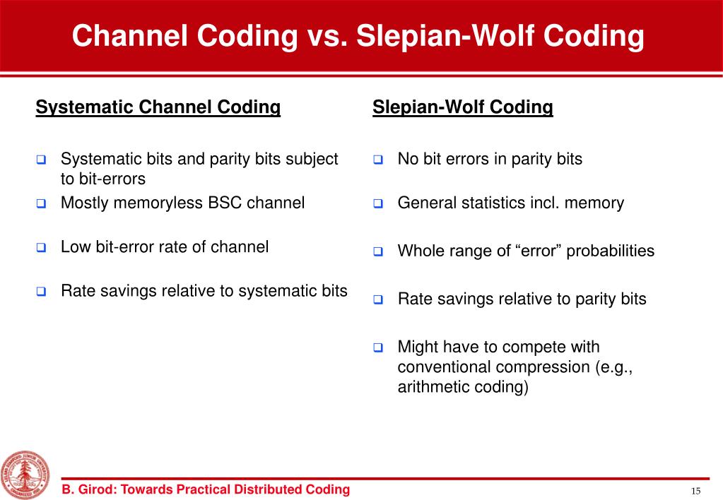 Systematic Channel Coding Systematic bits and parity bits subject to bit-errors Mostly memoryless BSC channel Low bit-error rate of channel Rate savings relative to systematic bits Slepian-Wolf Coding No bit errors in parity bits General statistics incl. memory Whole range of “error” probabilities Rate savings relative to parity bits Might have to compete with conventional compression (e.g., arithmetic coding) Channel Coding vs. Slepian-Wolf Coding