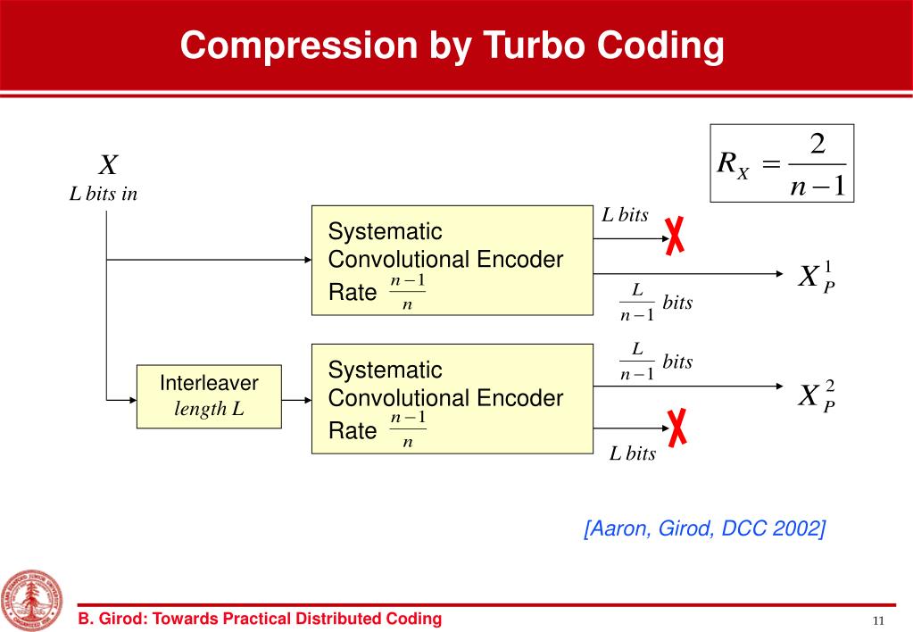 bits bits Interleaverlength L Compression by Turbo Coding L bits in L bits Systematic Convolutional Encoder Rate Systematic Convolutional EncoderRate L bits [Aaron, Girod, DCC 2002]