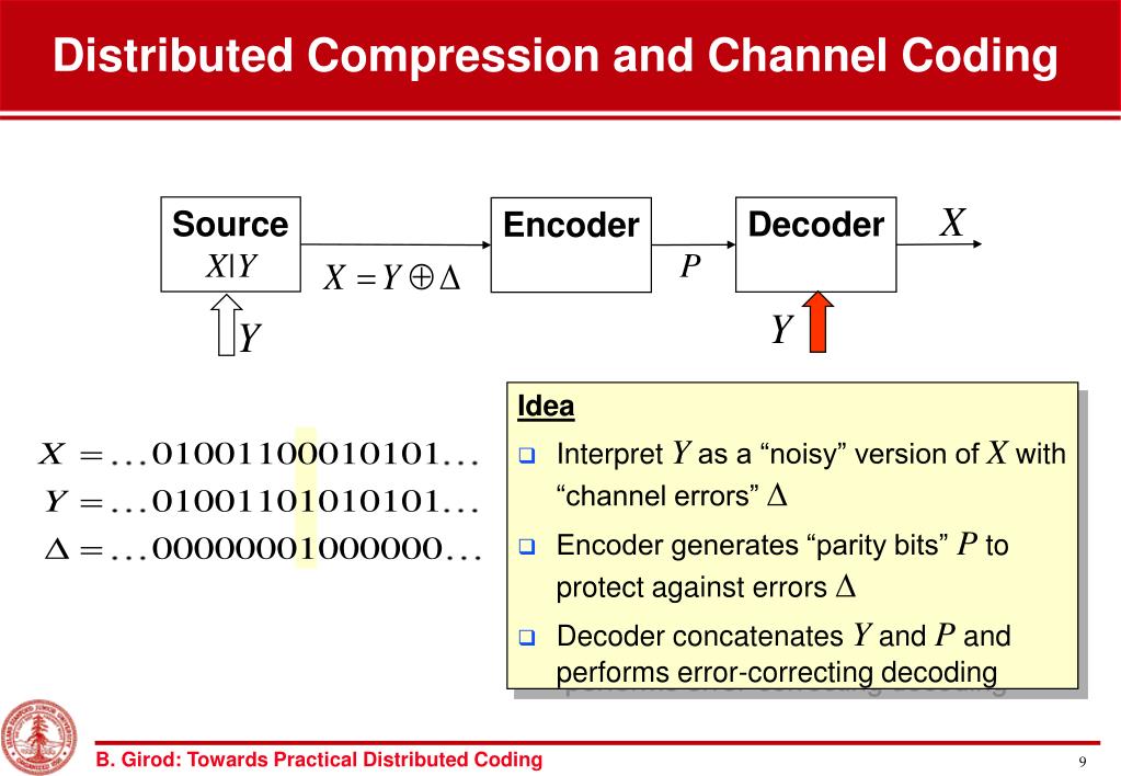 Idea Interpret Y as a “noisy” version of X with “channel errors” D Encoder generates “parity bits” P to protect against errors D Decoder concatenates Y and P and performs error-correcting decoding Distributed Compression and Channel Coding Source X|Y Decoder Encoder P