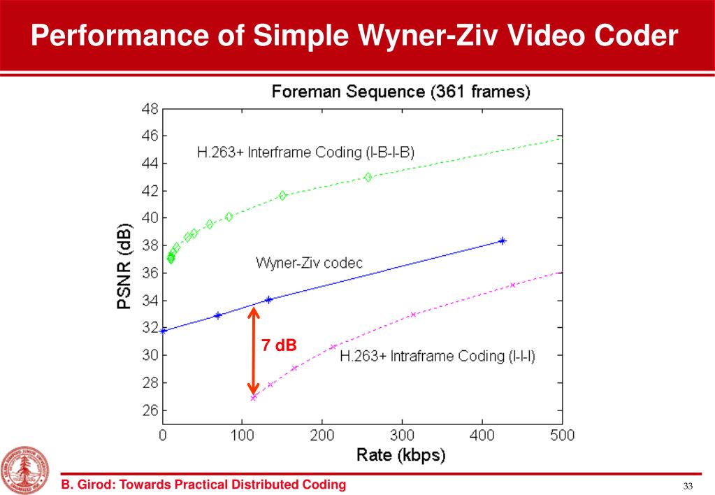 Error-resilient Video Transmissionwith Embedded Wyner-Ziv Codec Carphone CIF, 50 frames @ 30fps, 1 Mbps, 1% Random Macroblock loss [Aaron, Rane, Rebollo-Monedero, Girod, ICIP 2003]