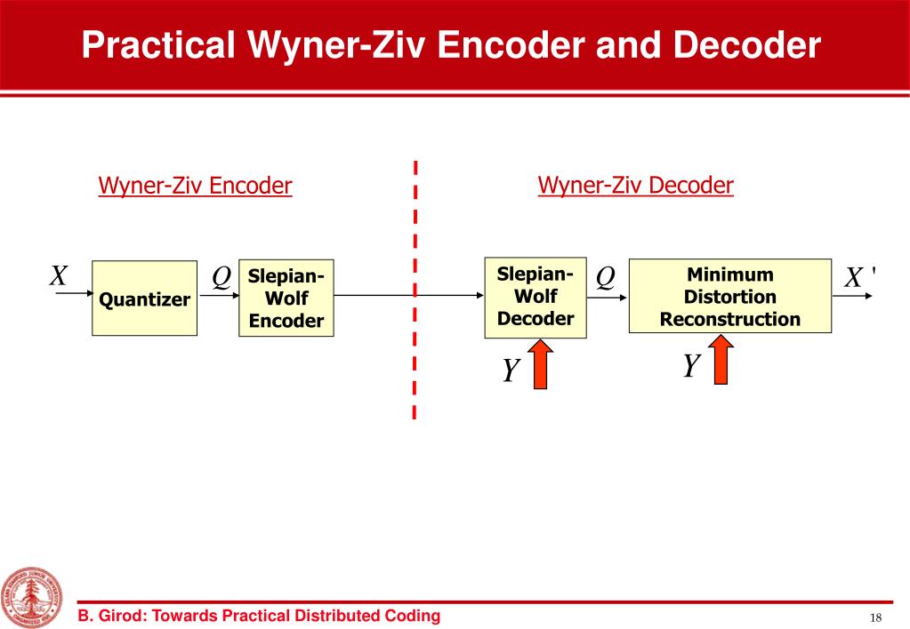 Practical Slepian-Wolf Encoding • Coset codes [Pradhan and Ramchandran, 1999] • Trellis codes [Wang and Orchard, 2001] • Turbo codes [Garcia-Frias and Zhao, 2001] [Bajcsy and Mitran, 2001] [Aaron and Girod, 2002] • LDPC codes [Liveris, Xiong, and Georghiades, 2002]