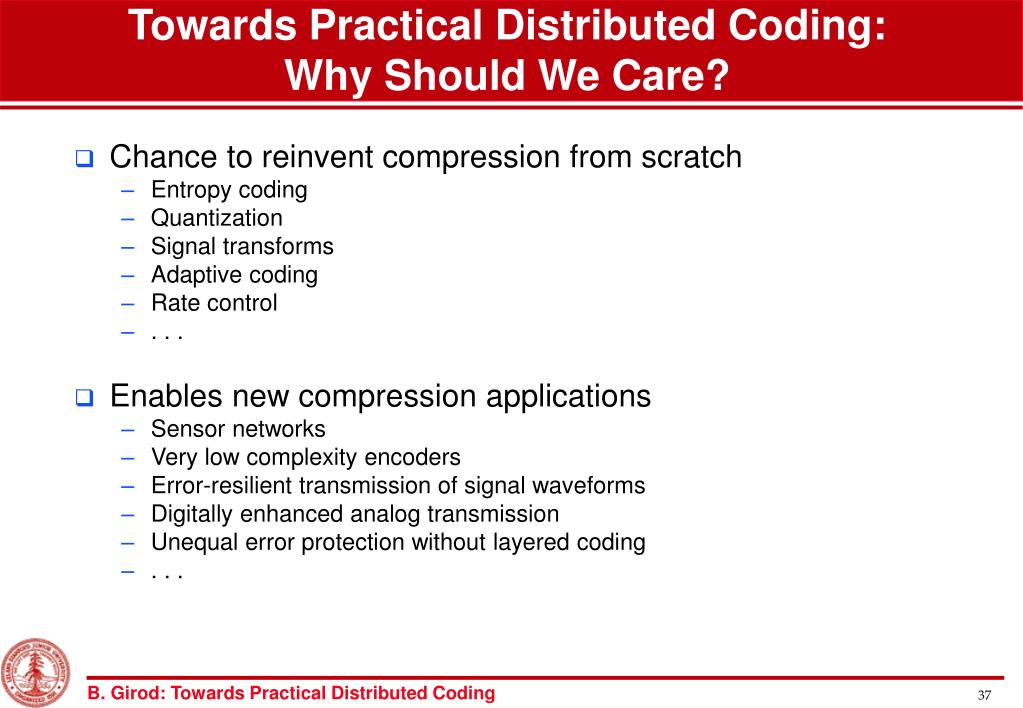 Towards Practical Distributed Coding:Why Should We Care? • Chance to reinvent compression from scratch • Entropy coding • Quantization • Signal transforms • Adaptive coding • Rate control • . . . • Enables new compression applications • Sensor networks • Very low complexity encoders • Error-resilient transmission of signal waveforms • Digitally enhanced analog transmission • Unequal error protection without layered coding • . . .