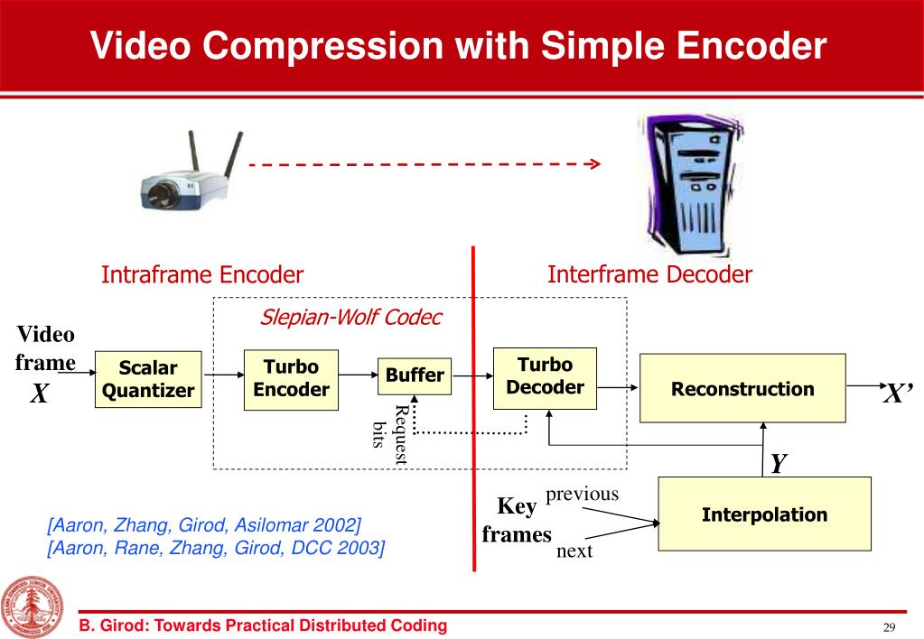 Interframe Decoder Intraframe Encoder Slepian-Wolf Codec Video frame Reconstruction Turbo Decoder Turbo Encoder Scalar Quantizer Buffer X’ X Request bits Y previous Interpolation Key frames next Video Compression with Simple Encoder [Aaron, Zhang, Girod, Asilomar 2002] [Aaron, Rane, Zhang, Girod, DCC 2003]