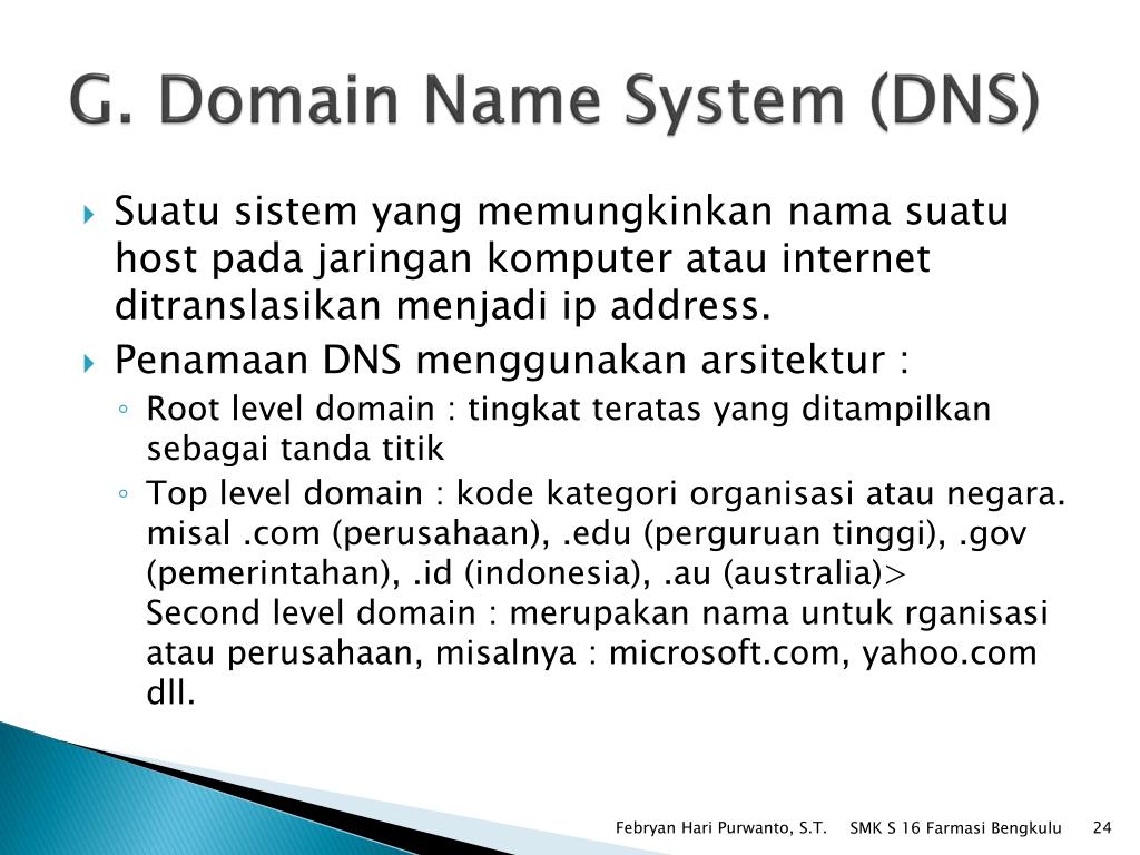 G. Domain Name System (DNS) • Suatusistem yang memungkinkannamasuatu host padajaringankomputeratau internet ditranslasikanmenjadiip address. • Penamaan DNS menggunakanarsitektur : • Root level domain : tingkatteratas yang ditampilkansebagaitandatitik • Top level domain : kodekategoriorganisasiataunegara. misal .com (perusahaan), .edu (perguruantinggi), .gov (pemerintahan), .id (indonesia), .au (australia)>Second level domain : merupakannamauntukrganisasiatauperusahaan, misalnya : microsoft.com, yahoo.com dll. Febryan Hari Purwanto, S.T.