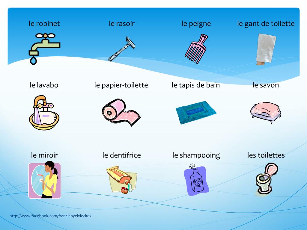 la brosse à dents la baignoire la cuvette la serviette la brosse à cheveux la ventouse la canalisation la douche la pomme de douche la brosse de toilette la goutte la chassed’eau la mousse la mousse à raser l’éponge la laque http://www.facebook.com/francianyelvleckek