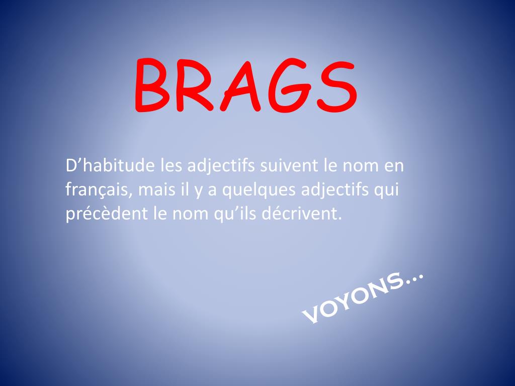 BRAGS D’habitude les adjectifssuivent le nom en français, maisil y a quelquesadjectifs qui précèdent le nom qu’ilsdécrivent. VOYONS…
