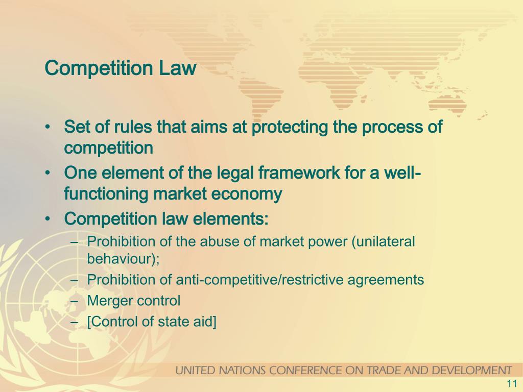 Competition Law • Set of rules that aims at protecting the process of competition • One element of the legal framework for a well-functioning market economy • Competition law elements: • Prohibition of the abuse of market power (unilateral behaviour); • Prohibition of anti-competitive/restrictive agreements • Merger control • [Control of state aid]