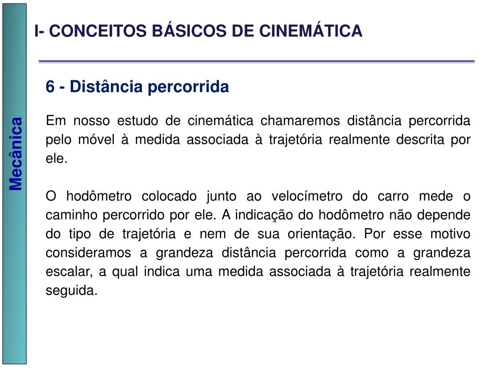 I- CONCEITOS BÁSICOS DE CINEMÁTICA 6 - Distância percorrida Em nosso estudo de cinemática chamaremos distância percorrida pelo móvel à medida associada à trajetória realmente descrita por ele. O hodômetro colocado junto ao velocímetro do carro mede o caminho percorrido por ele. A indicação do hodômetro não depende do tipo de trajetória e nem de sua orientação. Por esse motivo consideramos a grandeza distância percorrida como a grandeza escalar, a qual indica uma medida associada à trajetória realmente seguida.