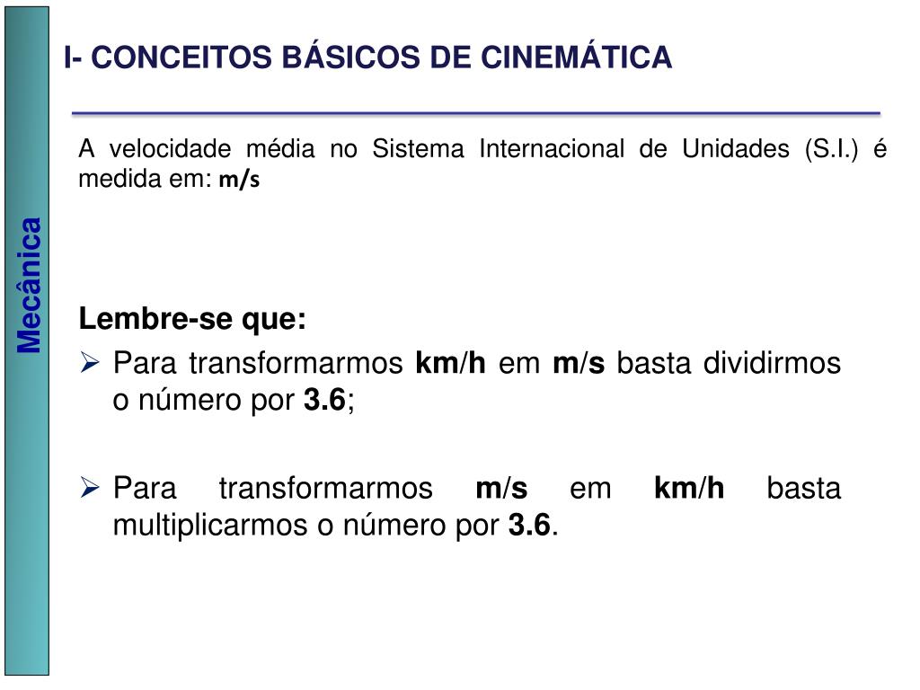 I- CONCEITOS BÁSICOS DE CINEMÁTICA A velocidade média no Sistema Internacional de Unidades (S.I.) é medida em: m/s Lembre-se que: • Para transformarmos km/h em m/s basta dividirmos o número por 3.6; • Para transformarmos m/s em km/h basta multiplicarmos o número por 3.6.