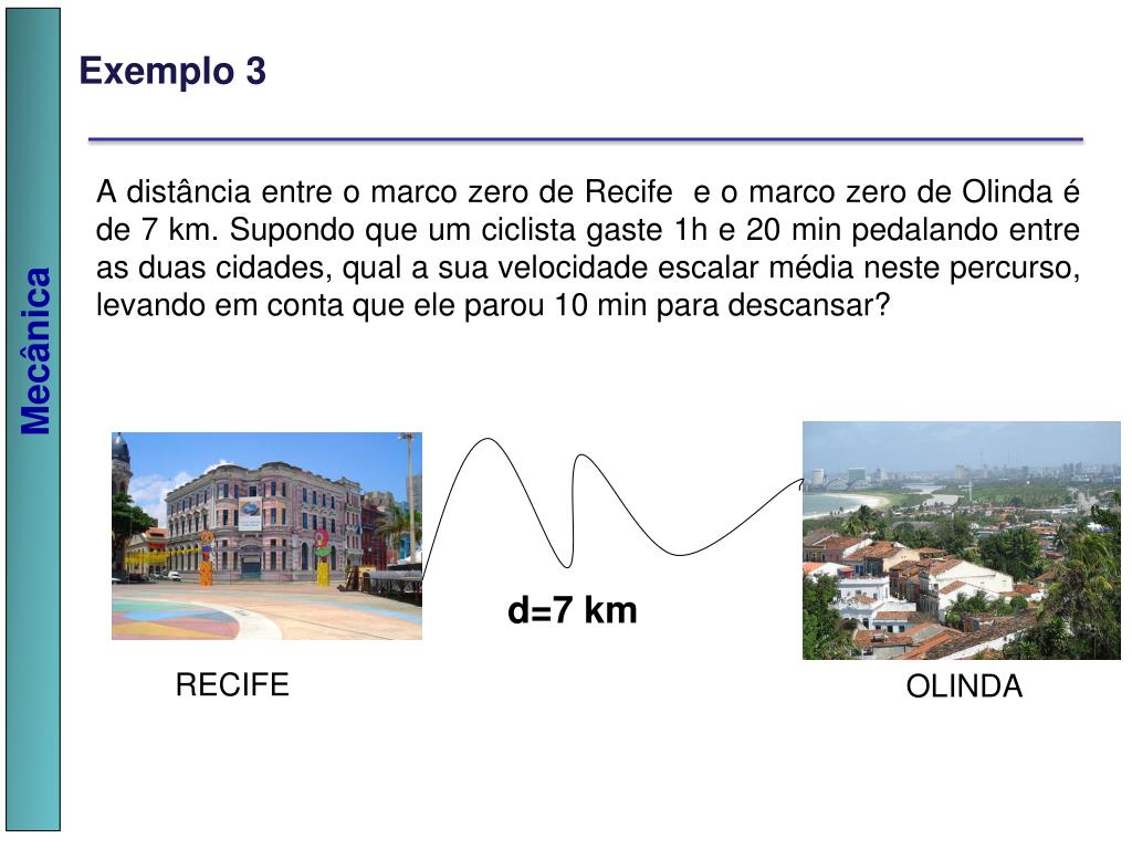 Exemplo 3 A distância entre o marco zero de Recife e o marco zero de Olinda é de 7 km. Supondo que um ciclista gaste 1h e 20 min pedalando entre as duas cidades, qual a sua velocidade escalar média neste percurso, levando em conta que ele parou 10 min para descansar? d=7 km RECIFE OLINDA