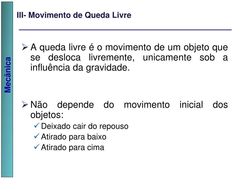 III- Movimento de Queda Livre • A queda livre é o movimento de um objeto que se desloca livremente, unicamente sob a influência da gravidade. • Não depende do movimento inicial dos objetos: • Deixado cair do repouso • Atirado para baixo • Atirado para cima