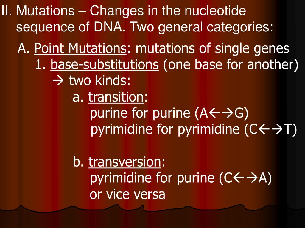 II. Mutations – Changes in the nucleotide sequence of DNA. Two general categories: • Point Mutations: mutations of single genes • 1. base-substitutions (one base for another) • two kinds: • a. transition: • purine for purine (AG) • pyrimidine for pyrimidine (CT) • b. transversion: • pyrimidine for purine (CA) • or vice versa