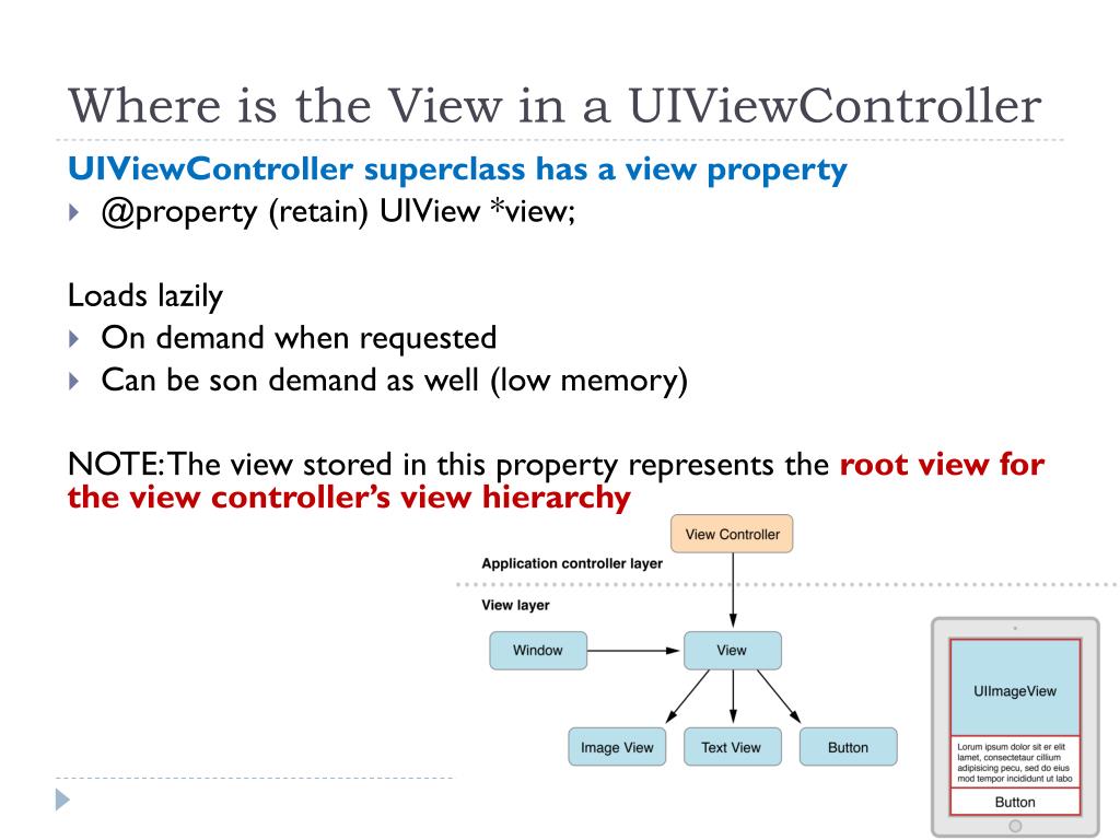 Where is the View in a UIViewController UIViewController superclass has a view property • @property (retain) UIView *view; Loads lazily • On demand when requested • Can be son demand as well (low memory) NOTE: The view stored in this property represents the root view for the view controller’s view hierarchy