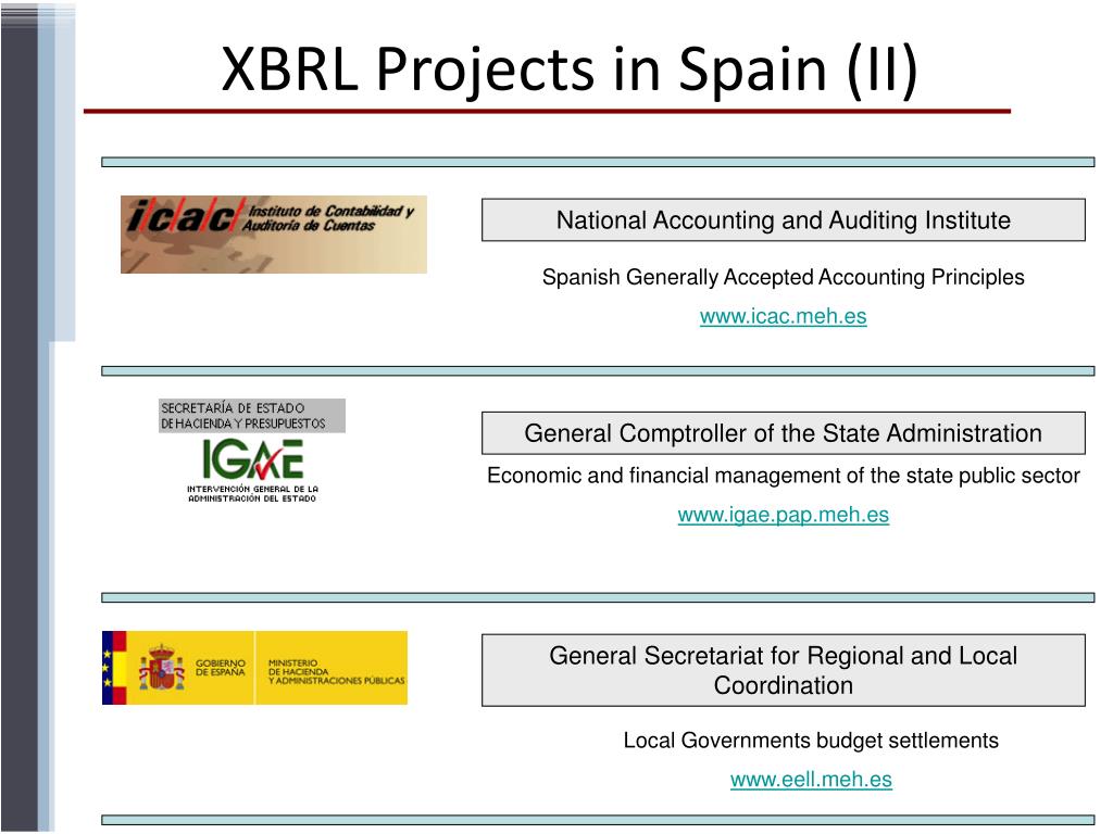 XBRL Projects in Spain (II) National Accounting and Auditing Institute Spanish Generally Accepted Accounting Principles www.icac.meh.es General Comptroller of the State Administration Economic and financial management of the state public sector www.igae.pap.meh.es General Secretariat for Regional and Local Coordination Local Governments budget settlements www.eell.meh.es