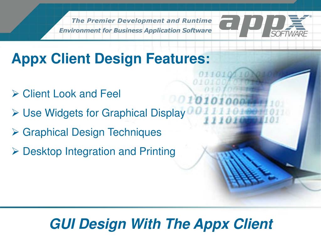 Appx Client Design Features: • Client Look and Feel • Use Widgets for Graphical Display • Graphical Design Techniques • Desktop Integration and Printing GUI Design With The Appx Client