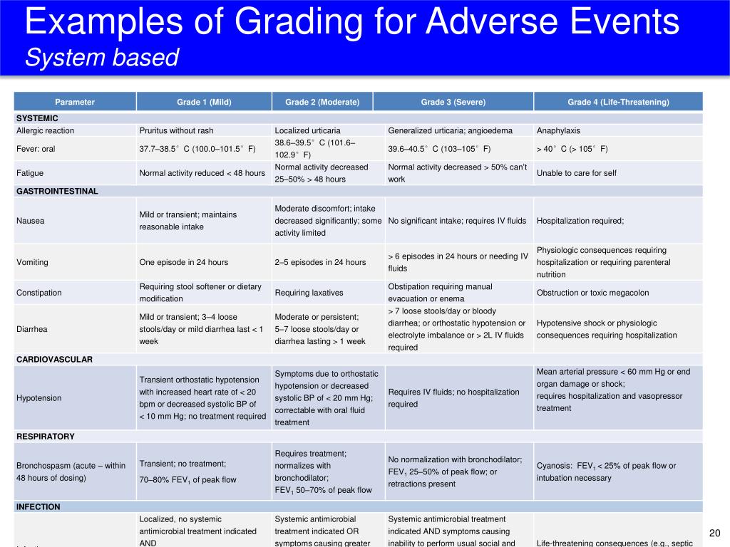 Decision making in clinical trialsClassification of severity of adverse event Adverse Event grade of severity • National Cancer Institute Common Terminology Criteria for Adverse Events (NCI CTCAE v.4)1 • Used in non-oncology for patients with moderate to severe disease • Mild, moderate to severe classification used (see examples in appendix) • In patients with less severe diseases • Healthy volunteers 1http://ctep.cancer.gov/protocolDevelopment/electronic_applications/ctc.htm#ctc_40