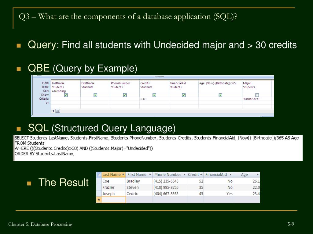 Q3 – What are the components of a database application (SQL)? • Query: Find all students with Undecided major and > 30 credits • QBE (Query by Example) • SQL (Structured Query Language) • The Result Chapter 5: Database Processing