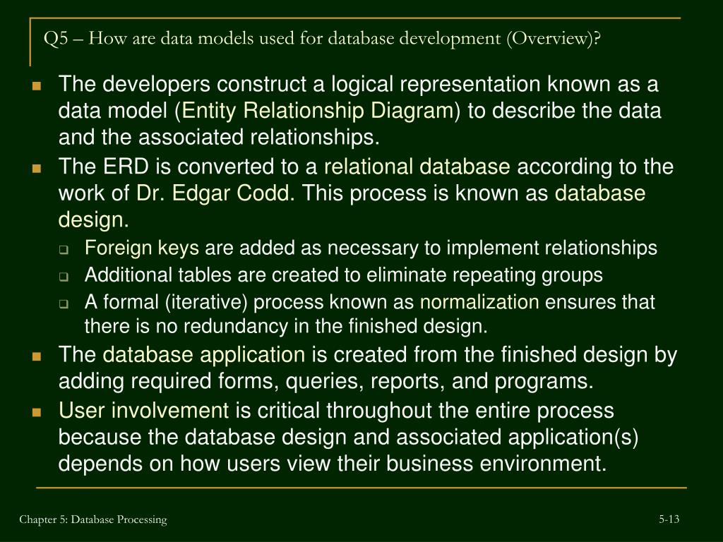 Q5 – How are data models used for database development (Overview)? • The developers construct a logical representation known as a data model (Entity Relationship Diagram) to describe the data and the associated relationships. • The ERD is converted to a relational database according to the work of Dr. Edgar Codd. This process is known as database design. • Foreignkeys are added as necessary to implement relationships • Additional tables are created to eliminate repeating groups • A formal (iterative) process known as normalization ensures that there is no redundancy in the finished design. • The databaseapplication is created from the finished design by adding required forms, queries, reports, and programs. • User involvement is critical throughout the entire process because the database design and associated application(s) depends on how users view their business environment. Chapter 5: Database Processing